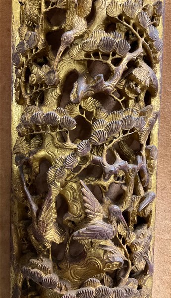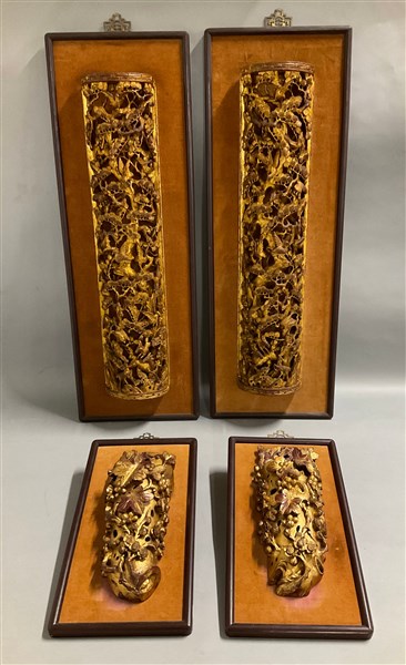 Due coppie di fregi in legno intagliato e dorato montato su pannelli Cina, fin