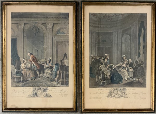Coppia di incisioni francesi a colori raffiguranti scene d'interno (cm 52x34) i