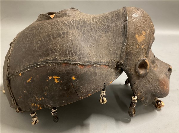 Arte africana, copricapo ricavato da un grande seme con parte anteriore in legno a forma di animale, rivestito in cuoio e decorato da cauri (l cm 32) (difetti)
