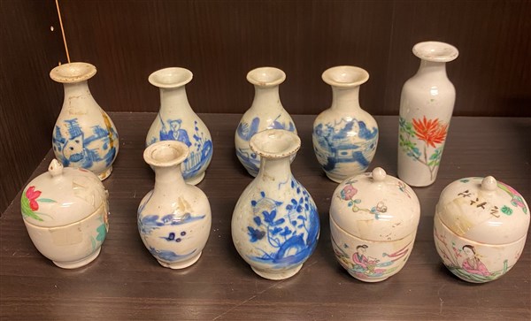 Lotto composto da sette piccoli vasetti e tre contenitori con coperchio in porc