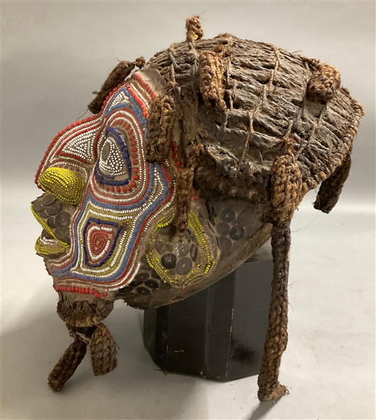 Arte africana, maschera con volto decorato da perline colorate e testa con juta