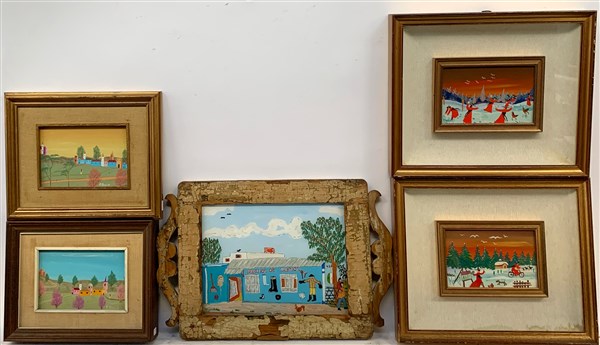 Lotto composto da cinque dipinti naif ad olio: due su masonite, due su cartone pressato e uno su vetro, di misure e autori diversi. Quattro in cornici, uno in cornice - vassoio