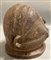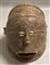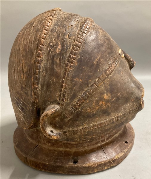 Arte africana, maschera casco in legno scolpito, tracce di pigmenti e cauri per occhi (h cm 28) (difetti e mancanze)