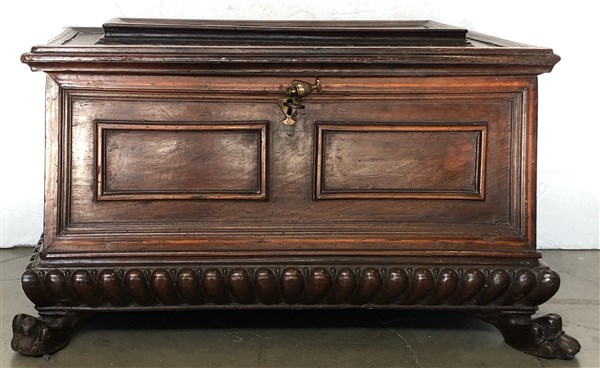 Antica cassapanca in noce con fronte, fianchi e coperchi pannelati e filettati