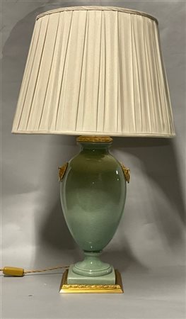 Lampada da tavolo a due luci in ceramica verde con guarnizioni e base in metallo dorato (h cm 80) con paralume