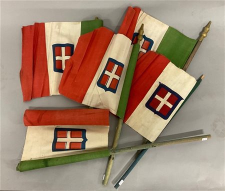 Gruppo di cinque bandierine decorative con scudo sabaudo in stoffa (difetti e m