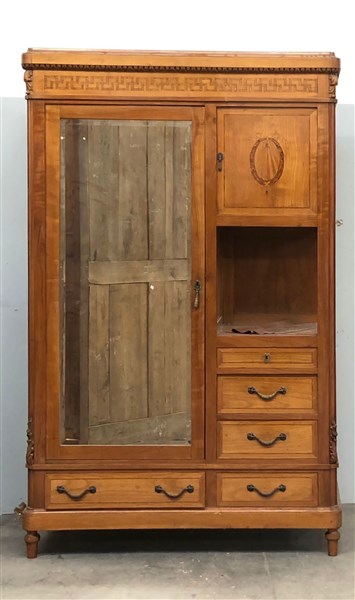 Armadio in legno a uno sportello con cassetti e vano a giorno, decorato da filettature, piccoli intarsi e inserti in legno intagliato (cm 140x220x59) (difetti)