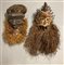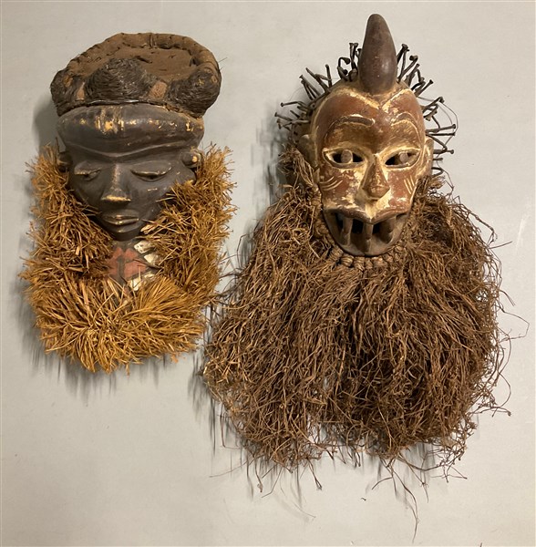 Arte africana, lotto di due maschere in legno scolpito e dipinto con chiodi, juta e crine vegetale (difetti)