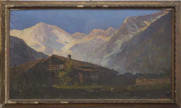 Lotto 702 | Luigi Liverani "Paesaggio montano con baite" olio su tela (cm 74x130) Firmato e