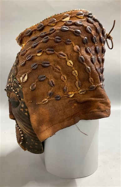 Arte africana, lotto di tre maschere di etnie differenti, legno scolpito e pigmenti, tessuto, perline e cauri (h max cm 40) (difetti e mancanze)