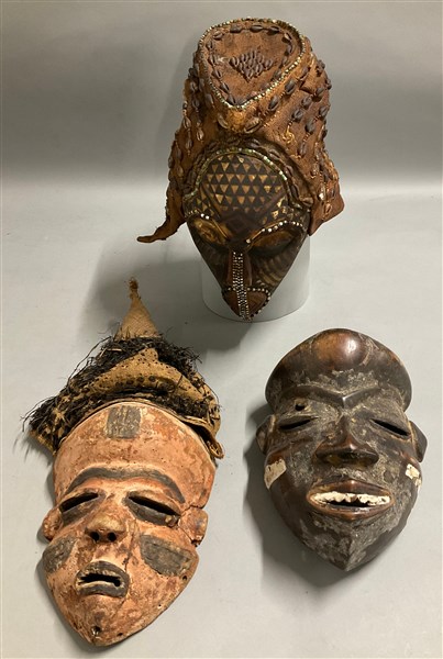 Arte africana, lotto di tre maschere di etnie differenti, legno scolpito e pigm