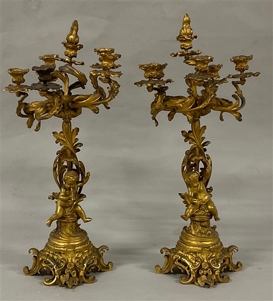 Coppia di candelabri in bronzo dorato a sei luci decorati con amorini allegoric
