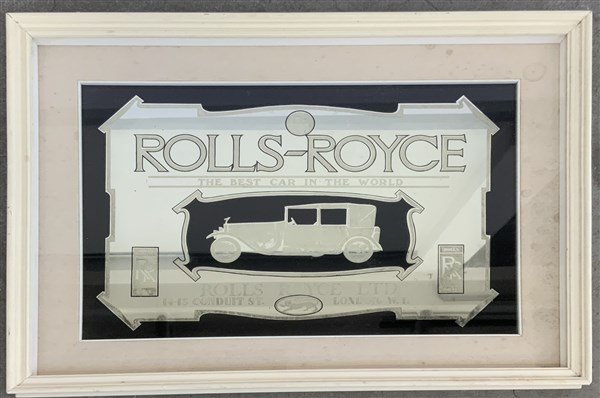 Lotto composto da tre manifesti e uno specchio pubblicitario serigrafato rolls-royce, misure differenti, in cornici (difetti)