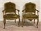 Coppia di poltrone di forma mossa in legno intagliato e dorato con sedute e spalliere rivestite in velluto verde (difetti)