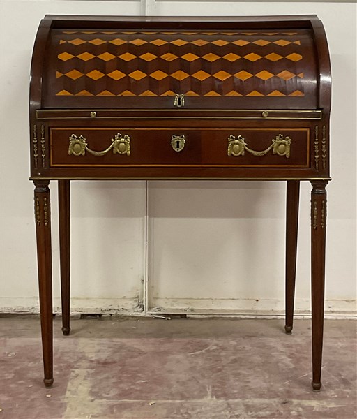 Scrittoio a rullo in legno filettato, anta intarsiata a marquetterie celante qu