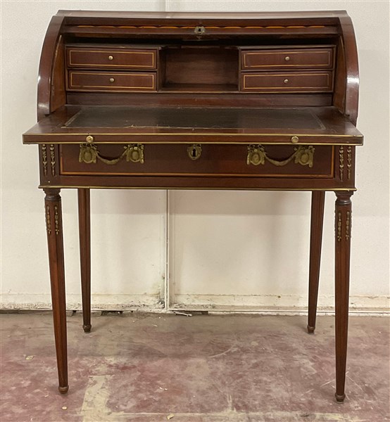Scrittoio a rullo in legno filettato, anta intarsiata a marquetterie celante quattro cassettini e vano a giorno, piano scorrevole montato in pelle impresso in oro, gambe tornite e scanalate, fregi e scarpette in bronzo dorato e cesellato (cm 78x102x50) (difetti e mancanze)