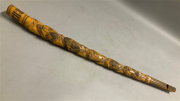 Arte africana, olifante in legno intagliato con decoro a figure e animali (l cm