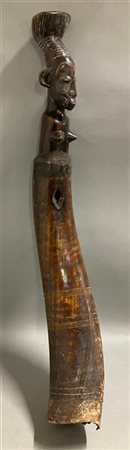Arte africana, olifante in corno inciso sormontato da figura femminile in legno scolpito (l cm 71) (difetti e mancanze)
