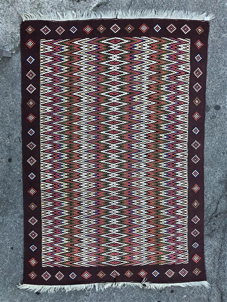 Tappeto Kilim Shustar, Persia, secolo XX. Decoro optical a zig-zag (cm 285x193) (lievi difetti)