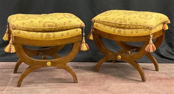 Coppia di panchetti in noce con gambe incrociate riunite da traversa tornita, sedute rivestite in tessuto a motivi floreali con cuscini asportabili. Secolo XIX (cm 50x48x40) (difetti e restauri)
