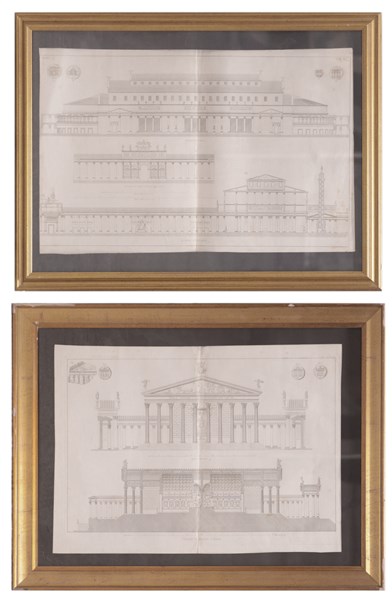 Lotto composto da due incisioni raffiguranti i prospetti del Foro Traiano e del Tempio di Venere a Roma (cm 46x70 ca.) in cornici (difetti)