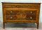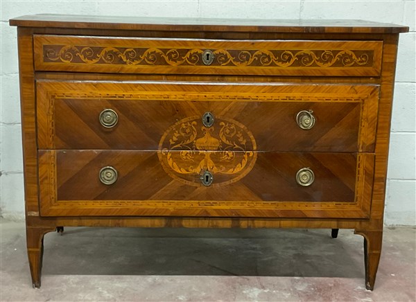 Comò a due cassetti e mezzo lastronato e intarsiato in legni vari. Fronte decorato con motivi vegetali e volute, riserva centrale con coppa, fiori e foglie. Medaglioni circolari sul piano e sui fianchi, piedi rastremati, secolo XVIII (cm 119x87x55) (difetti e reastauri)