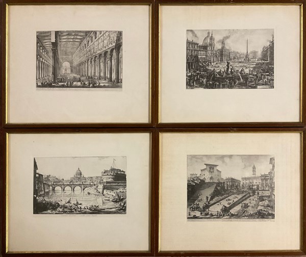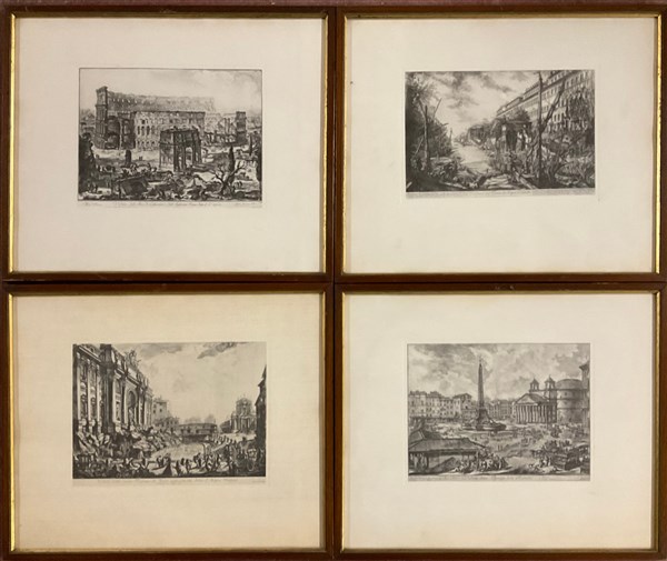 Gruppo di otto riproduzioni di antiche incisioni raffiguranti edifici e vedute romane, in cornici (cm tot 36x44) (lievi difetti)