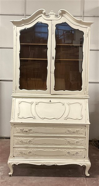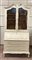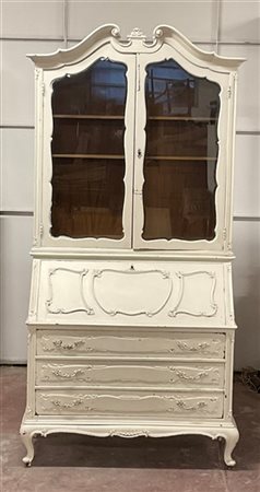 Trumeau in legno dipinto bianco decorato con sagomette in rilievo. Parte inferiore con tre cassetti e anta ribaltabile. Parte superiore con due ante a specchio (difetti)