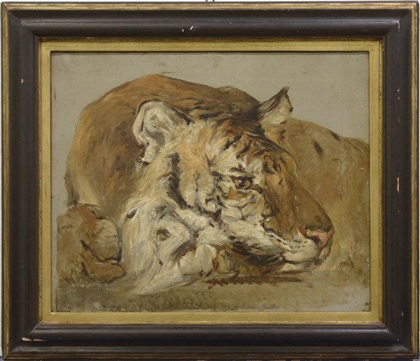 Ignoto francese del XIX Secolo "La tigre" olio su tela (cm 45x55) In cornice (difetti)