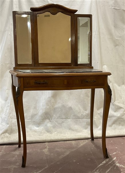 Lotto composto da un tavolo di forma mossa cassetto nella fascia, piano incassato con specchio tripartito ed una specchiera in legno (difetti)