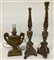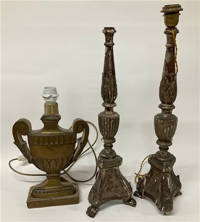 Lotto composto da due candelieri in legno intagliato e argentato ed un portapalme in rame sbalzato, montati a luce elettrica (h max cm 60) (difetti e mancanze)