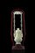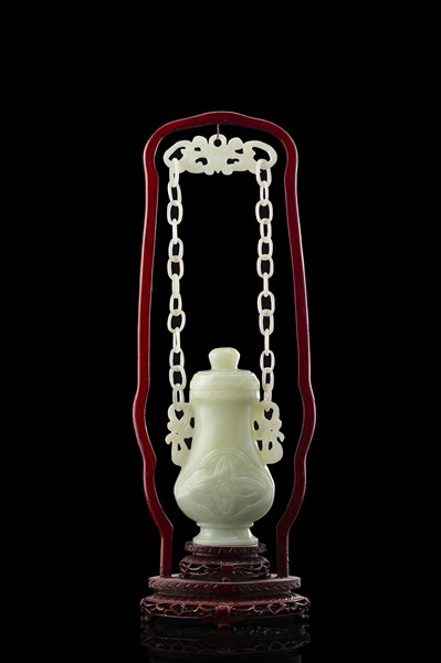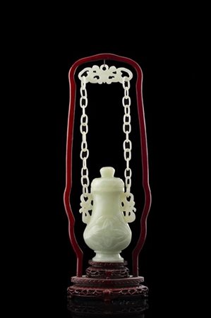 Vaso con coperchio in pietra dura verde, anse con catena e supporto in legno intagliato e laccato rosso