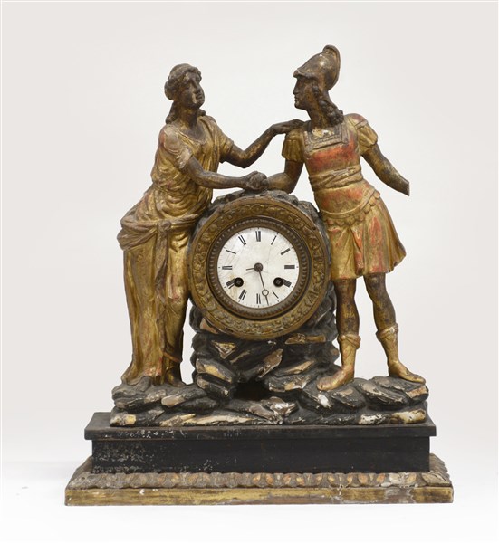 Pendola da tavolo in legno a soggetto mitologico. Quadrante in smalto bianco a cifre romane. Movimento con suoneria delle ore e mezze su campanello. Epoca cassa: inizio secolo XIX; epoca quadrante e meccanismo: fine secolo XIX (h. cm 43) (difetti, mancanze e sostituzioni)