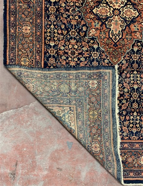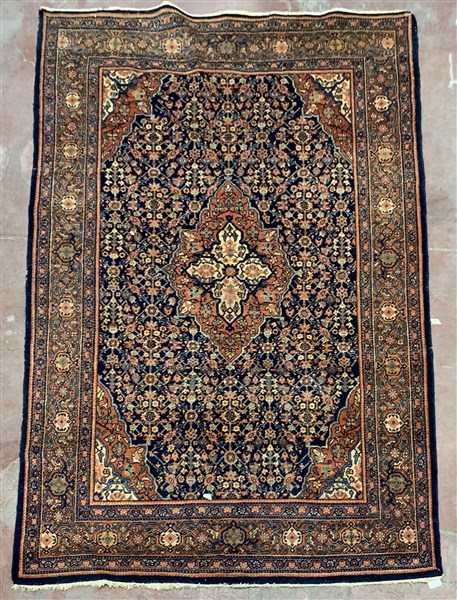 Tappeto Ferahkan, Persia, fine secolo XIX. Decoro a medaglione romboidale nei toni del bianco e pesca su fondo color blu notte decorato con motivo Herati. Bordura a testuggine su fondo pesca (cm 199x132) (lievi difetti)