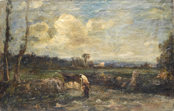 Antonio Fontanesi (Reggio Emilia, 1818 - Torino, 1882) NEI CAMPI, 1870-74 Olio su carta applicata su cartone, cm. 40,4x26 Siglato in basso a sinistra: “A F”. Sul verso, a penna: “Il presente dipinto è opera autentica/ di Antonio Fontanesi/ Llewelyn Lloyd” e “Approvo il giudizio/del collega Lloyd della/assoluta autenticità del/presente dipinto/O. Ghiglia”. Perizia tecnica e dichiarazione di autenticità del Centro Piemontese di Studi d’Arte Moderna e Contemporanea a cura di Angelo Dragone e archiviazione su fotografia con il numero 4054/R.Gen. In data 28 giugno 2001.