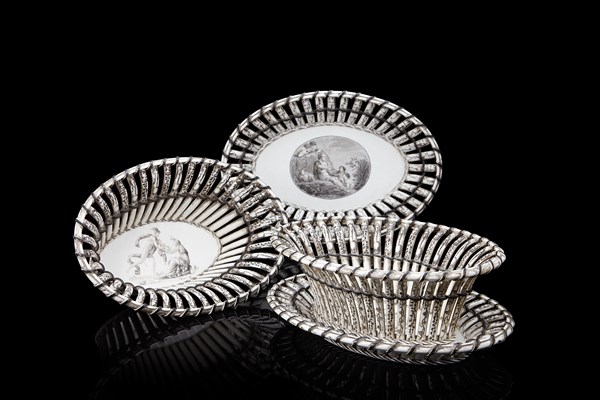 Manifattura francese Creil. Coppia di cestini con vassoi in terraglia decorati a scene classiche nei cavetti, figurine e mascheroni lungo le tese. Prima metà del secolo XIX (L. tot. cm 31) (lievi difetti)
