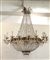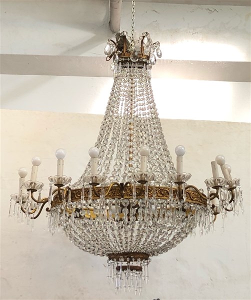 Lampada a sospensione a ventiquattro luci con cristalli pendenti e struttura in ottone. (difetti e mancanze)