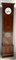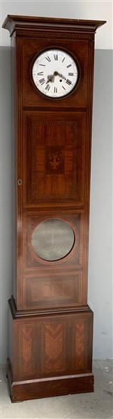 Orologio a torre in forma di regolatore con cassa parallelepipeda in legno decorato ad intarsio geometrico.