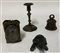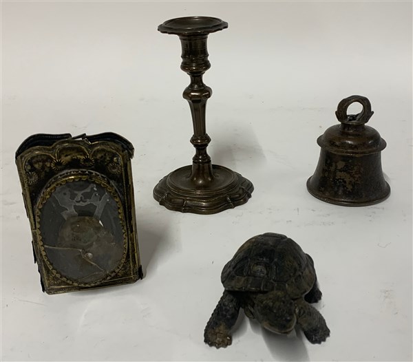 Lotto composto da una lanterna da viaggio, una campana, un candeliere e una tartaruga in bronzo e metallo.Secolo XVIII/XIX (difetti)