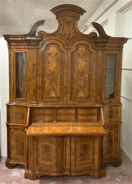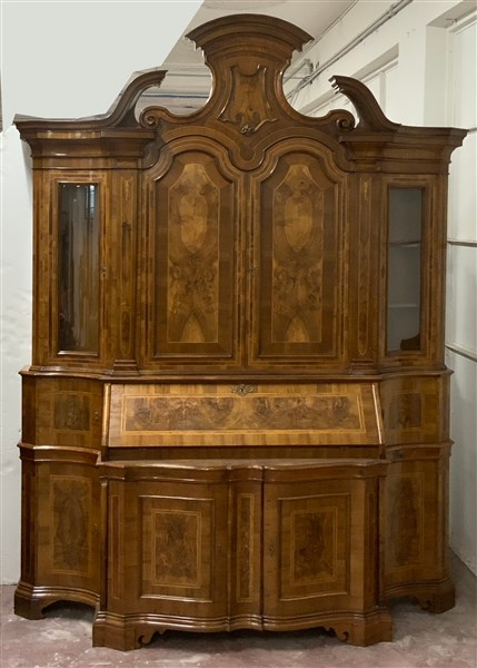 Mobile a due corpi di forma mossa lastronato, filettato e intarsiato. Parte inferiore a due ante centrali e due laterali sotto due sportelli, calatoia celante cassettini. Parte superiore a due ante centrali e due laterali vetrate sormontata da frontone spezzato (cm 200x60x266 circa) (lievi difetti)