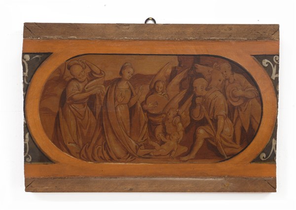 Lotto 976 | Antico dipinto raffigurante "Natività con pastori", olio su tavola (cm 30x43) (