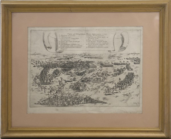 "Scene di battaglia" coppia di acqueforti (mm 293x414 all'impronta). In cornici