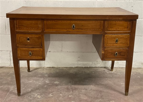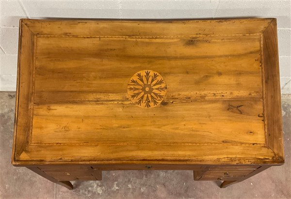 Antica scrivania in legno con profili filettati, piano e fianchi intarsiati a r