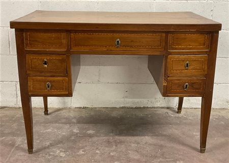 Antica scrivania in legno con profili filettati, piano e fianchi intarsiati a rosoni, fronte a cinque cassetti, gambe rastremate (cm 107x76x58) (difetti, restauri e mancanze)
