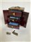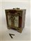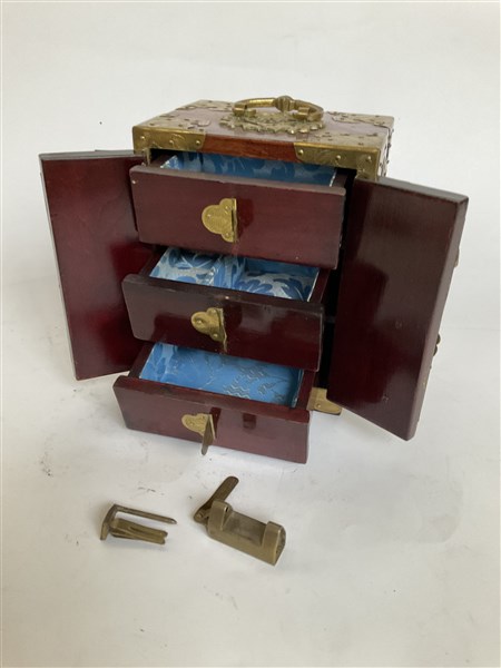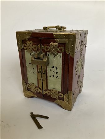 Portagioie cinese in legno a tre cassetti. Ante con pannelli in pietra dura ed inserti in giada sui fianchi. Chiusura a lucchetto con chiave a forcella (cm 18x14x11)