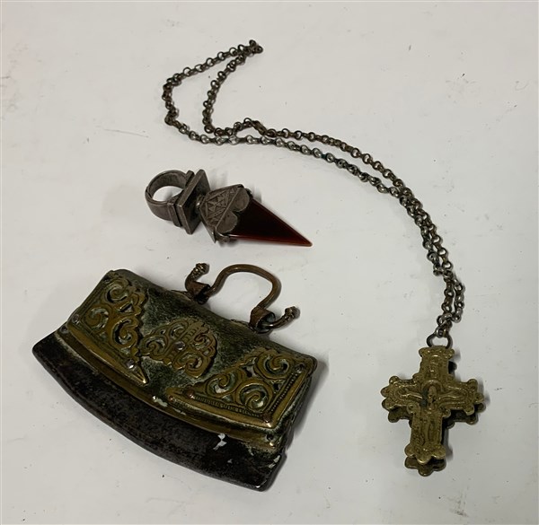 Lotto composto da un anello, un crocefisso con catanella ed un acciarino tibetano del secolo XIX (difetti)