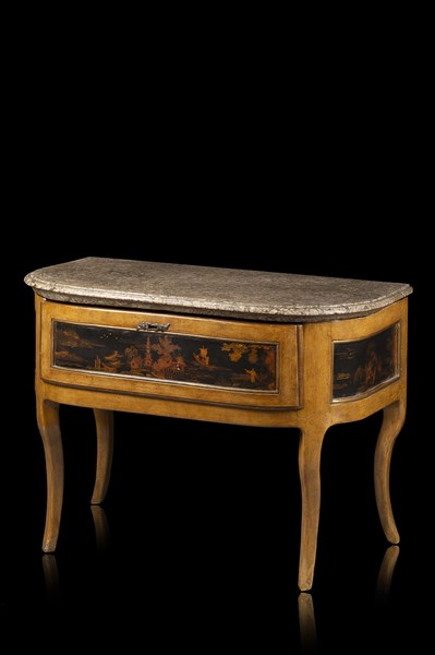 Tavolo da parete ad un cassetto con fronte e fianchi decorati da pannelli a chinoiserie entro profili dorati. Piano in alabastro, gambe mosse. Piemonte, secolo XVIII (cm 117x84,5x64) (difetti)