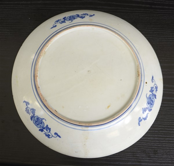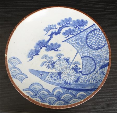 Manifattura giapponese, secolo XX. Piatto in porcellana con decoro bianco e blu raffigurante imbarcazione e alberi (d cm 33)(difetti)