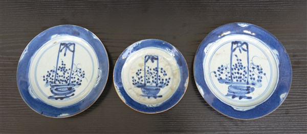 Manifattura orientale sec. XX. Lotto di tre piatti in porcellana con decoro bia