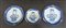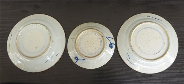 Manifattura orientale sec. XX. Lotto di tre piatti in porcellana con decoro bianco e blu (d cm 20 e cm 15)(difetti)